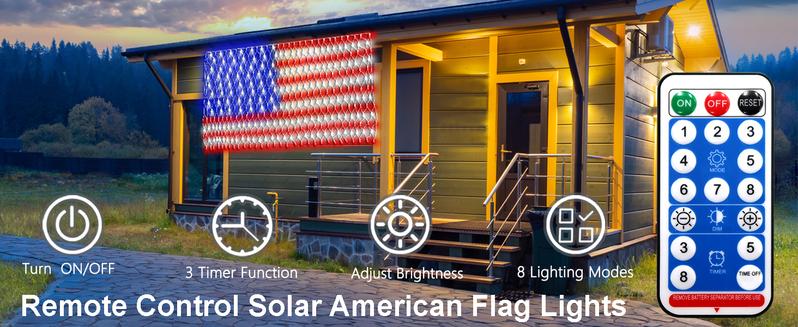 Remote-Controlled Solar Flag Light:Our solar flag light remote offers 8 Lighting Modes / Brightness Adjustment / Timing Settings, and the remote range is about 10ft. Show Your American Pride at Night Time 4th of July Red White Blue Decorations